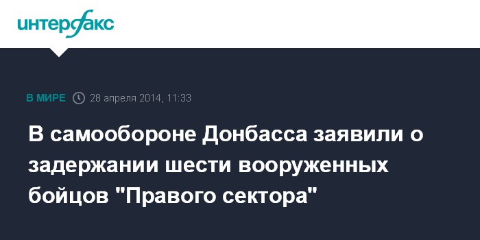 "Под утро мы задержали под Славянском шесть человек с оружием, переодетых в гражданскую одежду. По нашим данным, это бойцы "Правого сектора", которые готовили у нас диверсии", - сказал "Интерфаксу" по телефону представитель штаба самообороны Донбасса.