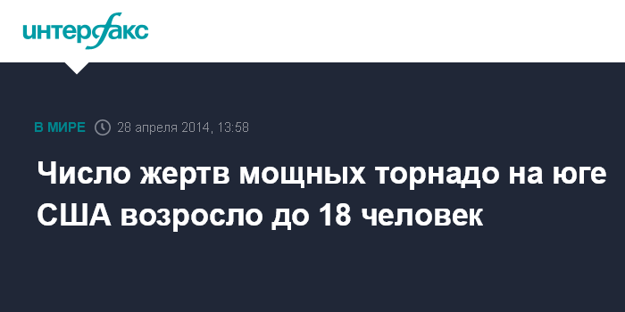 Москва. 28 апреля. INTERFAX.RU - По меньшей мере 18 человек погибли из-за торнадо, обрушившихся на штаты Арканзас, Айова и Оклахома на юге США, сообщают в понедельник американские СМИ со ссылкой на Национальную метеорологическую службу США. Ранее сообщалось о 12 жертвах.