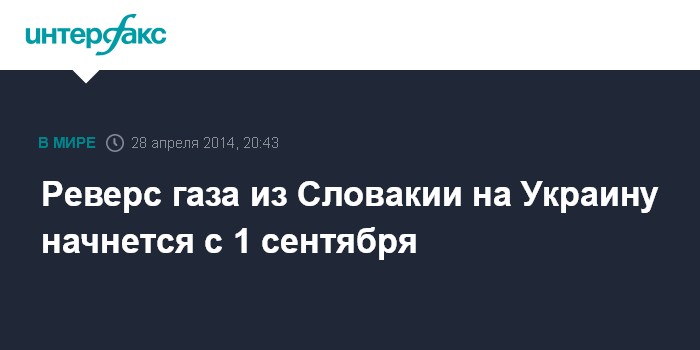 Москва. 28 апреля. INTERFAX.RU - Реверсные поставки природного газа со стороны Словакии на Украину планируется начать с 1 сентября 2014 года, сообщили агентству "Интерфакс" в пресс-службе "Укртрансгаза".