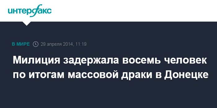 Москва. 29 апреля. INTERFAX.RU - Милиция задержала восемь наиболее активных участников произошедшей 28 апреля в Донецке драки между участниками митинга "За единую Украину" и противниками евромайдана, сообщил во вторник отдел по связям общественностью ГУМВД Украины в Донецкой области.