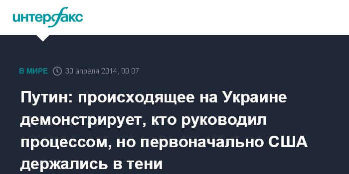 Минск. 30 апреля. INTERFAX.RU - То, что происходит сейчас на Украине, показывает, кто руководил процессом с самого начала, но первоначально США предпочитали держаться в тени, заявил президент РФ Владимир Путин.