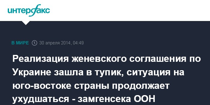Нью-Йорк (ООН). 30 апреля. INTERFAX.RU - Ситуация в ряде областей юго-восточной Украины продолжает ухудшаться на фоне отсутствия реализации договоренностей, достигнутых на четырехсторонней встрече в Женеве, заявил в среду заместитель генсека ООН по политическим вопросам Джеффри Фелтман.