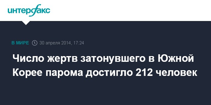Москва. 30 апреля. INTERFAX.RU - Число жертв крушения парома "Севоль" в Южной Корее достигло 212 человек, сообщает Associated Press. Именно такое количество тел водолазы к настоящему времени извлекли на поверхность.