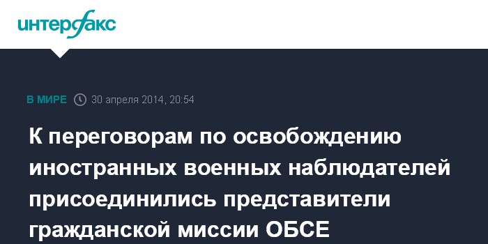 Москва. 30 апреля. INTERFAX.RU - Переговоры по освобождению группы военных наблюдателей ОБСЕ в Славянске (Донецкая обл.) продолжаются, сообщает министерство обороны Украины.
