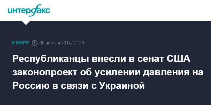 Москва. 30 апреля. INTERFAX.RU - Члены Республиканской партии США предложили сенату рассмотреть проект документа, содержащий более эффективные меры воздействия на Россию в связи с ее позицией по Украине, передает в среду агентство Associated Press.