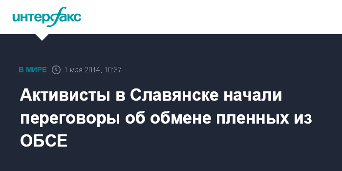 Москва. 1 мая. INTERFAX.RU - Активисты сил самообороны Славянска начали переговоры с киевскими властями об обмене задержанных представителей ОБСЕ на своих соратников, заявил "Интерфаксу" "народный мэр" Славянска Вячеслав Пономарев.