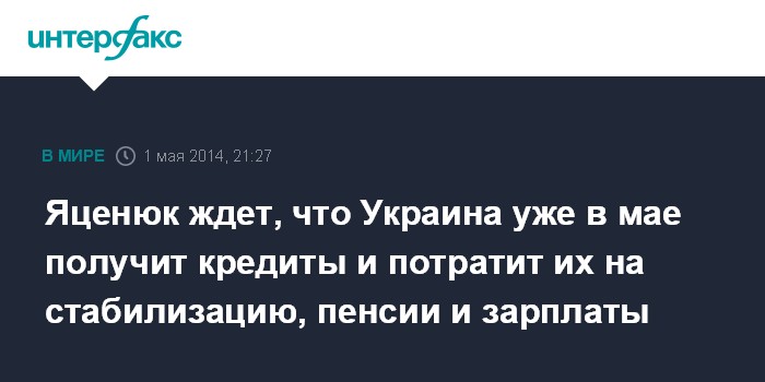 Москва. 1 мая. INTERFAX.RU - В мае Украина получит более $5 млрд кредитных средств, которые пойдут на стабилизацию экономики страны и выплату пенсий и зарплат, заявил премьер-министр Украины Арсений Яценюк.