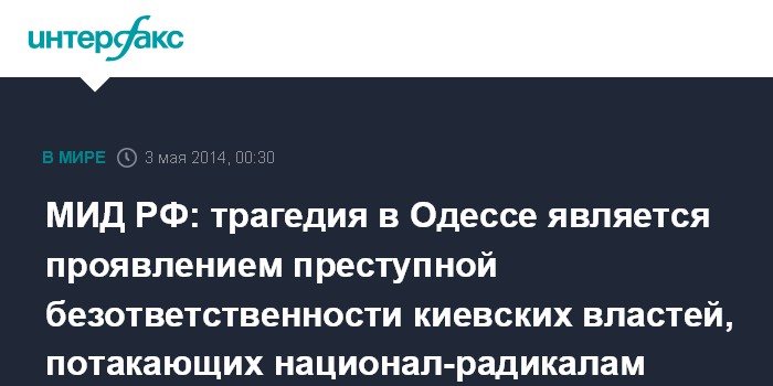 МИД РФ: трагедия в Одессе является проявлением преступной безответственности киевских властей, потакающих национал-радикалам