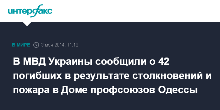 Москва. 3 мая. INTERFAX.RU - Вследствие столкновений и пожара в Доме профсоюзов на Куликовом поле Одессы, возникших 2 мая, погибло 42 человека, 125 человек получили телесные повреждения и госпитализированы, среди пострадавших - 21 милиционер, сообщается на сайте МВД со ссылкой на министра внутренних дел Украины Арсена Авакова. Ранее одесская милиция сообщала о 37 погибших