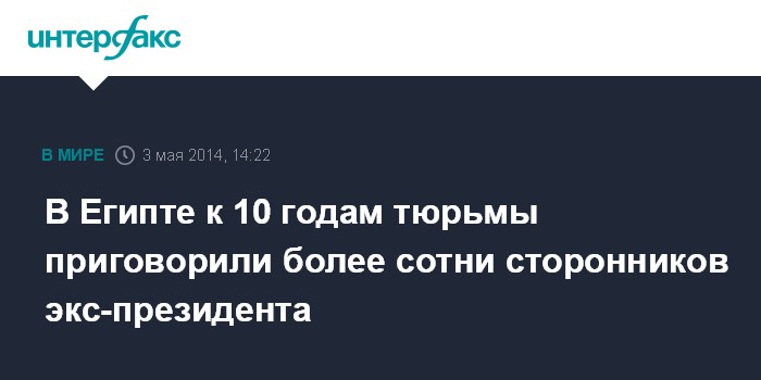 Москва. 3 мая. INTERFAX.RU - Суд в Каире вынес приговор ста двум сторонникам свергнутого прошлым летом президента Мухаммеда Мурси - 10 лет тюремного заключения, сообщают арабские СМИ. По их сведениям, еще двое приговорены к семи годам тюрьмы. СМИ напоминают, что правительство, приведенное к власти военными, задержало с июля прошлого года тысячи соратников Мурси.
