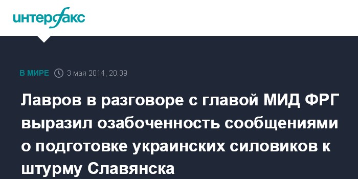 С.Лавров выразил озабоченность сообщениями "о подготовке украинской армией при поддержке "Правого сектора" к штурму ряда городов на юго-востоке Украины, включая г.Славянск", отметили на Смоленской площади.
