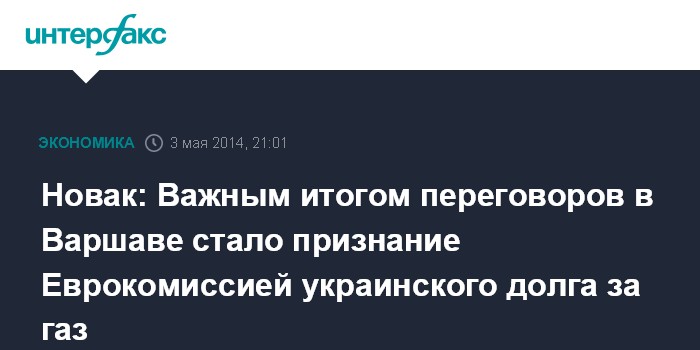 Москва. 3 мая. ИНТЕРФАКС-АНИ - Важным итогом трехсторонних консультаций, которые состоялись 2 мая в Варшаве, стало признание Еврокомиссией украинского долга за газ, заявил журналистам министр энергетики РФ Александр Новак.