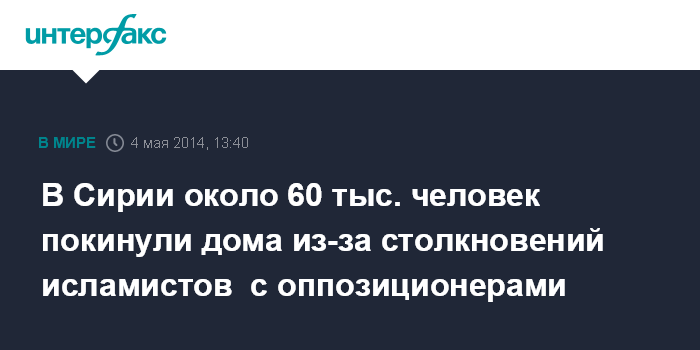 Москва. 4 мая. INTERFAX.RU - Около 60 тыс. жителей восточных районов Сирии были вынуждены покинуть дома и бежать в другие части страны в связи с обострением вооруженных столкновений между радикальными исламистами и умеренными противниками режима президента Башара Асада, сообщил наблюдательный совет по правам человека в Сирии.