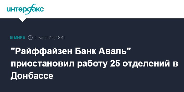 Москва. 5 мая. INTERFAX.RU - "Райффайзен Банк Аваль" (Киев) приостановил работу 25 отделений в охваченных беспорядками Донецкой в Луганской областях. Об этом сообщили в пресс-службе кредитно-финансового учреждения.