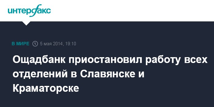 Москва. 5 мая. INTERFAX.RU - Государственный ощадный банк Украины (Ощадбанк, Киев) приостановил работу всех отделений в Славянске и Краматорске (Донецкая обл.), сообщили "Интерфаксу" в пресс-службе кредитно-финансового учреждения.