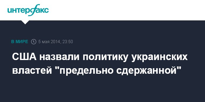 Москва. 5 мая. INTERFAX.RU - Руководство Украины продемонстрировало очень большую сдержанность на фоне разворачивающихся событий на востоке страны, сообщила в понедельник представитель госдепа США Мари Харф.