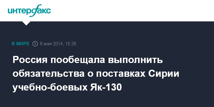 Ранее газета "Коммерсантъ" со ссылкой на источники в структурах, связанных с экспортом вооружений, сообщила, что "Рособоронэкспорт" и Объединенная авиастроительная корпорация (ОАК) сформировали график поставок учебно-боевых самолетов Як-130 для вооруженных сил Сирии. До конца текущего года в плане значится поставка девяти самолетов, в 2015 году - двенадцати, а в 2016-м - еще пятнадцати. Таким образом, Россия выполнит обязательства по ранее подписанному контракту на 36 самолетов Як-130, отмечалось в публикации.