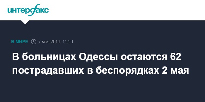 Москва. 7 мая. INTERFAX.RU - В больницах Одессы на утро 7 мая остается 62 пострадавших во время трагических событий 2 мая, из них 26 человек в тяжелом состоянии находятся в отделениях интенсивной терапии, сообщает пресс-служба горсовета.