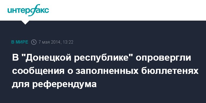 Москва. 7 мая. INTERFAX.RU - Глава Центризбиркома Донецкой народной республики Роман Лягин опроверг заявление Службы безопасности Украины о том, что бюллетени для референдума 11 мая были заполнены заранее.