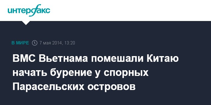 Москва. 7 мая. INTERFAX.RU - Власти Вьетнама заявили, что ВМС страны оказали противодействие китайским кораблям, которые собирались установить буровую вышку для добычи нефти в Южно-Китайском море в районе спорных Парасельских островов, сообщает в среду агентство AP.