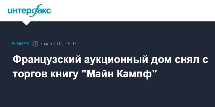 Москва. 7 мая. INTERFAX.RU - Парижский аукционный дом Pierre Berge & Associes не будет выставлять на торги скандально известную книгу Адольфа Гитлера "Майн Кампф", пишет в среду французская газета Le Figaro.