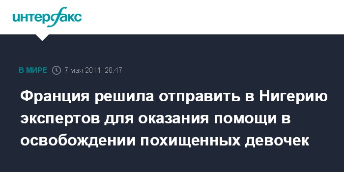 Москва. 7 мая. INTERFAX.RU - Франция отправят в Нигерию специалистов, которые будут участвовать в операции по освобождению из плена учениц, похищенных террористами из школы в середине апреля, заявил в среду глава МИД Лоран Фабиус.