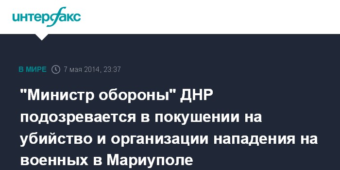 Москва. 7 мая. INTERFAX.RU - Задержанный "министр обороны" так называемой Донецкой народной республики (ДНР) Игорь Какидзянов подозревается в организации нападения на военную часть в Мариуполе, которое произошло 16 апреля, сообщил помощник министра внутренних дел Украины Антон Геращенко.