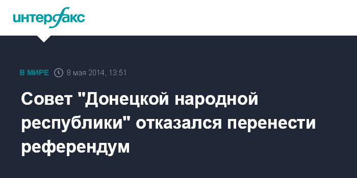 Москва. 8 мая. INTERFAX.RU - Члены народного совета "Донецкой народной республики" решили не переносить референдум о независимости региона, заявил "Интерфаксу" сопредседатель правительства ДНР Мирослав Руденко. Как и запланировано, референдум пройдет в воскресенье, 11 мая.