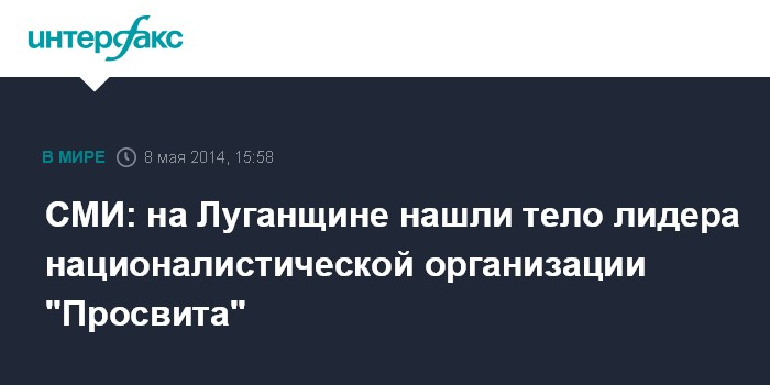 Москва. 8 мая. INTERFAX.RU - В Грековском лесу в Луганской области обнаружено тело главы националистической организации "Просвита" в Красном Лимане (город в Донецкой области. - ИФ) Валерия Сало.