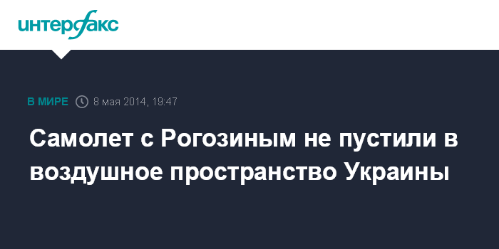 Москва. 8 мая. INTERFAX.RU - Самолет вице-премьера правительства РФ Дмитрия Рогозина, который направлялся в Кишинев, не пустили в воздушное пространство Украины.