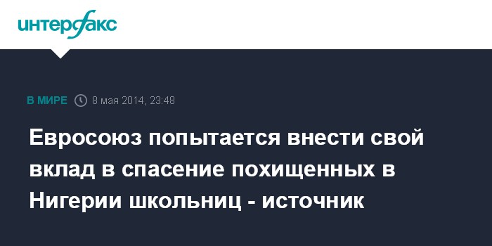 Брюссель. 8 мая. INTERFAX.RU - Европейский союз намерен участвовать с помощью имеющихся у него средств в поисках похищенных в Нигерии боевиками исламистской группировки "Боко харам" свыше двухсот девочек-школьниц, заявил в четверг в Брюсселе журналистам высокопоставленный чиновник ЕС.