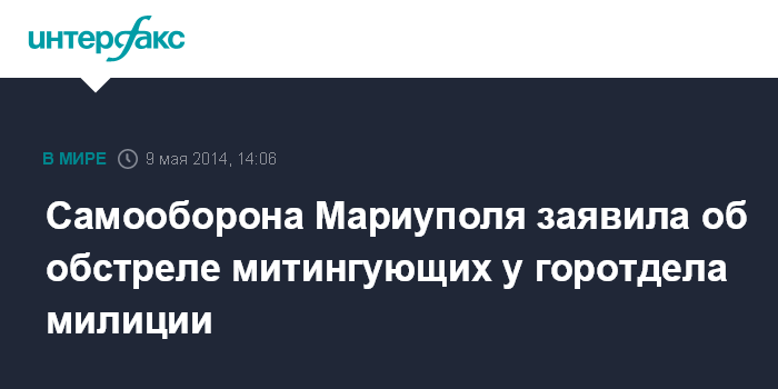 Москва. 9 мая. INTERFAX.RU - Силы самообороны в Мариуполе утверждают, что украинские силовики, штурмующие горотдел милиции, открыли огонь по собравшимся на митинг в защиту горотдела людям. "Множество людей, пришедших на торжественный митинг в честь Дня победы, отправились к зданию горотдела, где устроили стихийную акцию в поддержку забаррикадировавшихся милиционеров. Люди выкрикивали в адрес силовиков: "Фашисты!". Один из БТР развернулся в сторону митинговавших и открыл огонь на поражение", - рассказал "Интерфаксу" представитель штаба самообороны.