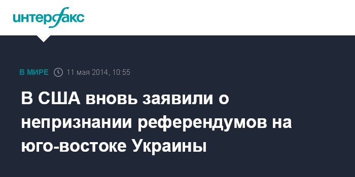 Москва. 11 мая. INTERFAX.RU - США продолжают настаивать на незаконности референдумов о самоопределении в Донецкой и Луганской областях Украины, заявила представитель американского госдепартамента Дженнифер Псаки. "Согласно законодательству Украины, эти референдумы незаконны и являются попыткой создать дальнейший раскол и беспорядок", - говорится в ее заявлении.