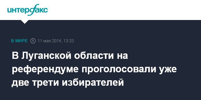 Москва. 11 мая. INTERFAX.RU - По состоянию на 12:00 местного времени в воскресенье явка избирателей на референдуме в Луганской области составила 65%, сообщил председатель ЦИК региона Александр Малыхин.