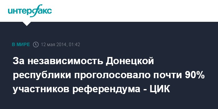 Москва. 12 мая. INTERFAX.RU - За государственную самостоятельность Донецкой области на референдуме о самоопределении региона проголосовало 89,07% избирателей, сообщил журналистам председатель Центризбиркома Донецкой народной республики Роман Лягин на пресс-конференции в ночь на понедельник.