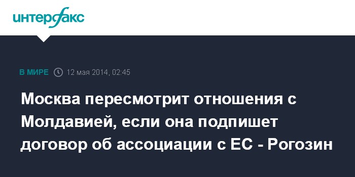 Москва. 12 мая. INTERFAX.RU - Экономические отношения России и Молдавии могут быть пересмотрены, если она подпишет соглашение об ассоциации с ЕС, заявил вице-премьер России Дмитрий Рогозин.