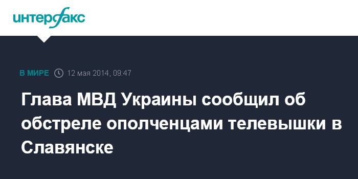 Москва. 12 мая. INTERFAX.RU - Ополченцы в ночь на понедельник снова обстреляли телевышку в Славянске. Украинские военнослужащие, охраняющие объект, не пострадали, сообщил министр внутренних дел Украины Арсен Аваков.