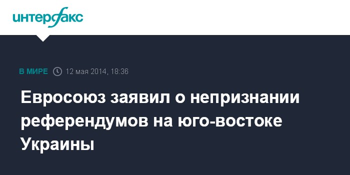 Москва. 12 мая. INTERFAX.RU - Главы МИД стран-членов Евросоюза не признают итоги референдумов в Донецкой и Луганской областях, сообщила в понедельник глава европейской дипломатии Кэтрин Эштон.