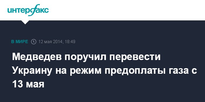 Москва. 12 мая. INTERFAX.RU - Премьер-министр РФ Дмитрий Медведев поручил "Газпрому" с 13 мая ввести для Украины авансовую систему платежей за газ.