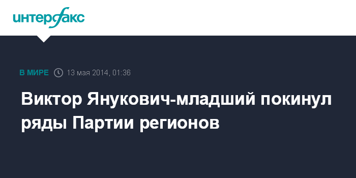 Киев. 13 мая. INTERFAX.RU - Сын Виктора Януковича, народный депутат Украины Виктор Янукович-младший заявляет о выходе из состава партии и фракции Партии регионов.