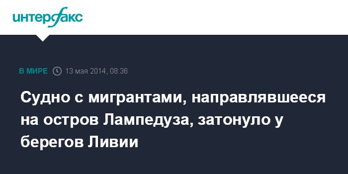 Москва. 13 мая. INTERFAX.RU - Не менее 14 человек стали жертвами затонувшего у берегов Ливии судна с мигрантами, пытавшимися добраться до итальянского острова Лампедуза, передает британская телерадиовещательная корпорация BBC.