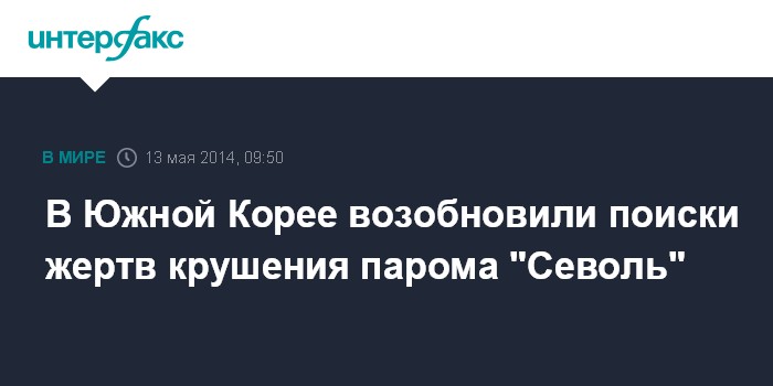 Москва. 13 мая. INTERFAX.RU - Южнокорейские власти приняли решение возобновить во вторник поисковые операции на месте крушения парома "Севоль".