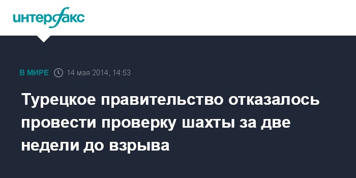 Москва. 14 мая. INTERFAX.RU - Правительство Турции отклонило запросы на проверку шахт рядом с городом Сома за три недели до взрыва, жертвами которого стали более 200 шахтеров, сообщила газета Hurriyet daily news.