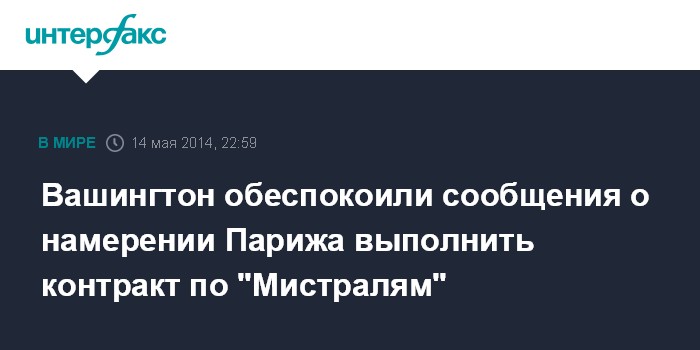 Москва. 14 мая. INTERFAX.RU - Власти США выражают обеспокоенность информацией о том, что Франция собирается выполнить контракт по поставке французских вертолетоносцев "Мистраль" в Россию, заявил в среду представитель Белого дома Джей Карни.