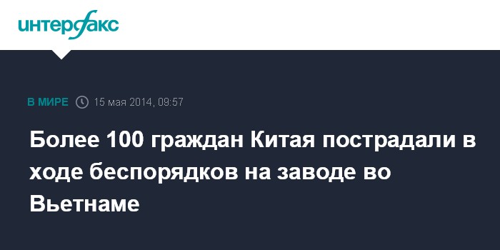 Москва. 15 мая. INTERFAX.RU - В результате погрома на заводе в провинции Хатинь, учиненного вьетнамскими демонстрантами, погиб один китайский рабочий, сообщает в четверг местная полиция. Еще более 100 граждан КНР получили ранения.