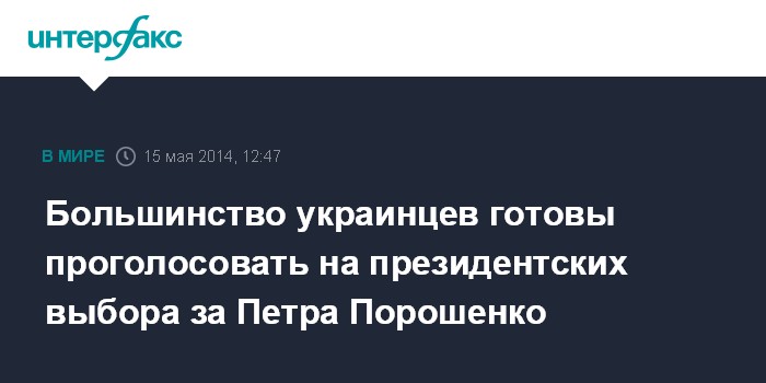 Москва. 15 мая. INTERFAX.RU - Из общего числа избирателей, готовых придти на выборы и определившихся с кандидатом в президенты Украины, за бизнесмена Петра Порошенко проголосуют 54,7%, свидетельствуют результаты социсследования "Электоральные настроения населения Украины за две недели до президентских выборов".