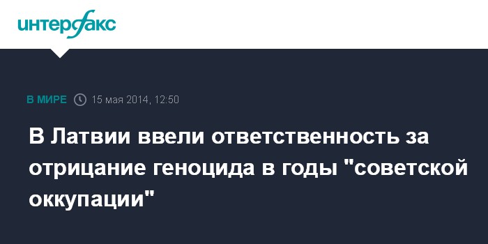 Москва. 15 мая. INTERFAX.RU - Сейм Латвии в четверг принял поправки к Уголовному закону, которые предусматривают ответстванность за отрицание преступлений, совершенных в годы "советской оккупации".