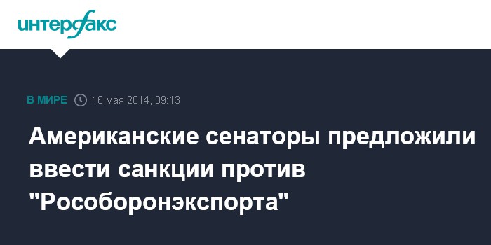 Москва. 16 мая. INTERFAX.RU - Американские законодатели предлагают ввести санкции против "Рособоронэкспорта". Документы под названием "Акт об эмбарго на российское вооружение 2014" подготовили трое сенаторов – Дэн Коутс, Джон Корин и Ричард Блюменталь.