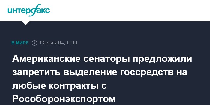 Москва. 16 мая. INTERFAX.RU - Три американских сенатора внесли в конгресс законопроект, запрещающий любое расходование государственных средств США на контракты и соглашения с Рособоронэкспортом с целью наказать Москву в связи с кризисом в Украине.