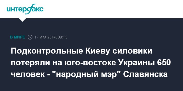 Москва. 17 мая. INTERFAX.RU - Один из лидеров ополчения Донбасса, "народный мэр" Славянска Вячеслав Пономарев утверждает, что подконтрольные Киеву силовики и иностранные наемники понесли существенные потери в ходе боестолкновений на юго-востоке Украины.